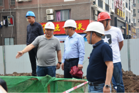 (圖為方紫微同志、涂軼銘同志向嚴(yán)悌文同志介紹施工情況)