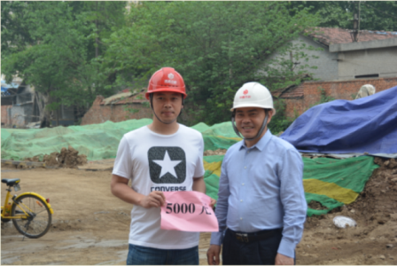 (圖為項(xiàng)目部經(jīng)理彭軼同志接受集團(tuán)公司“五一”勞動(dòng)節(jié)慰問金)