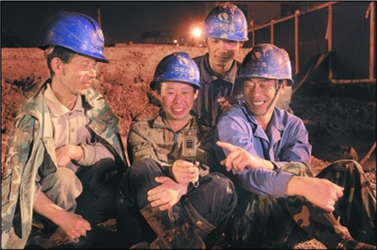 照片中有親情,有武漢大建設(shè),有消防官兵在廢墟的閃光,有笑臉,有武漢的樞紐火車軌道,有摩登城市大武漢全景,有黃昏的火燒云,而令我眼前一亮的是,一張最普通的照片:四個(gè)農(nóng)民工的自拍照,熟悉的工地,樸素的笑臉,頭上的安全帽印著“漢陽(yáng)市政”四個(gè)字及l(fā)ogo。