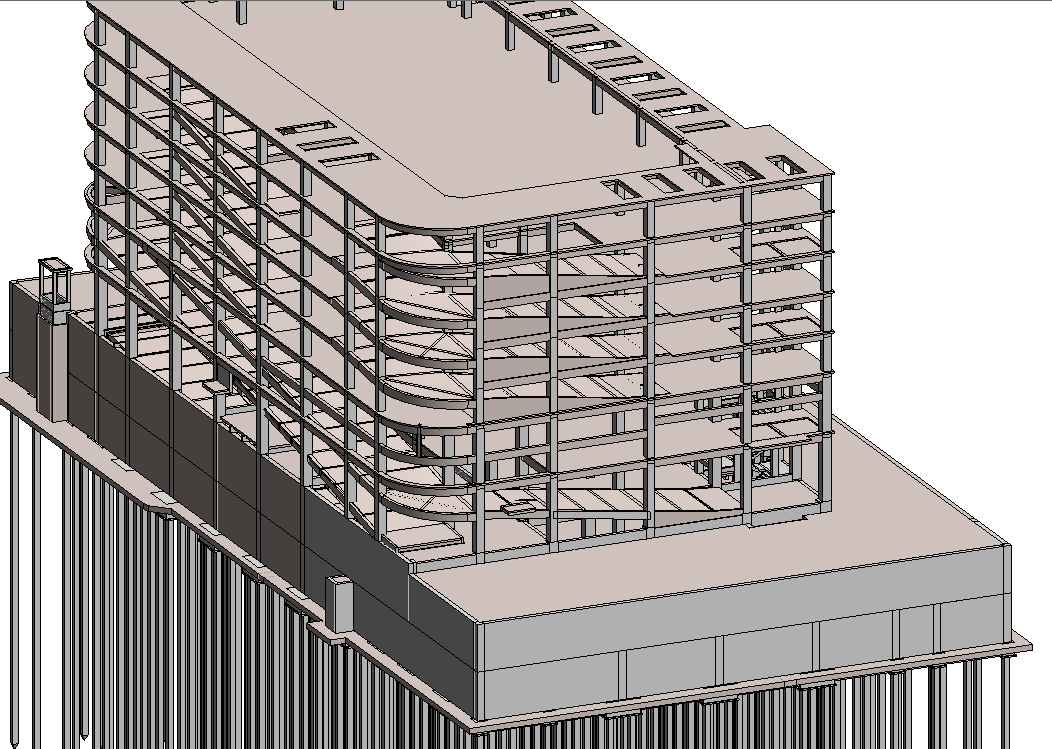 BIM技術(shù)提效率。面對(duì)停車(chē)樓從地下室至屋面的復(fù)雜的坡道結(jié)構(gòu),項(xiàng)目部積極采用BIM模型技術(shù)指導(dǎo)現(xiàn)場(chǎng)施工,用三維模型給工人技術(shù)交底,讓工人熟悉坡道的每一弧形梁與直梁的位置關(guān)系,更為精確地領(lǐng)會(huì)設(shè)計(jì)意圖,完全將圖紙吃透。
